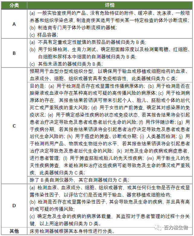 下表为根据IVDR Regulation (EU) 2017/746附录VIII分类规则,汇总A、B、C、D四个等级相关器械产品清单。[2]