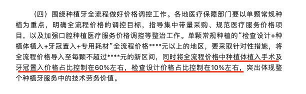 单颗常规种植的“检查设计+种植体植入+牙冠置入+专用耗材”全流程价格****元以上的地区,要采取针对性措施,将全流程价格导入至每颗不超过****元的新区间,同时将全流程价格中种植体植入手术及牙冠置入价格占比控制在60%左右,检查设计价格占比控制在10%左右,突出体现整个种植牙服务中的技术劳务价值。