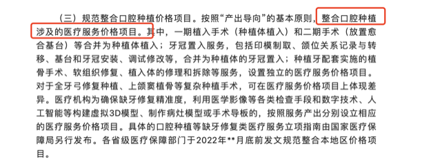 种植体植入费、牙冠置入费、植骨手术费等口腔种植项目实行政府指导价管理的地区,医疗保障部门在规范价格项目的同时,重新制定公布政府指导价。各省级医疗保障部门要在2022年**月底前完成口腔种植医疗服务的价格调整工作。