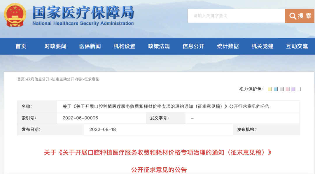 8月18日晚,国家医保局发布“关于《关于开展口腔种植医疗服务收费和耗材价格专项治理的通知(征求意见稿)》公开征求意见的公告”(以下简称《意见稿》),对口腔种植医疗服务费和耗材价格进行统一规范。征求截止时间为2022年8月27日。《意见稿》重点梳理如下: