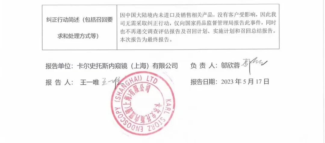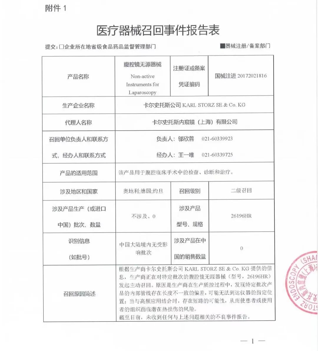 卡尔史托斯内窥镜(上海)有限公司报告,由于特定批次产品的内部管线存在长度不一致的问题,生产商卡尔史托斯公司KARL STORZ SE & Co. KG对腹腔镜无源器械Non-active Instruments for Laparoscopy(国械注进20172021816)主动召回。召回级别为二级召回。