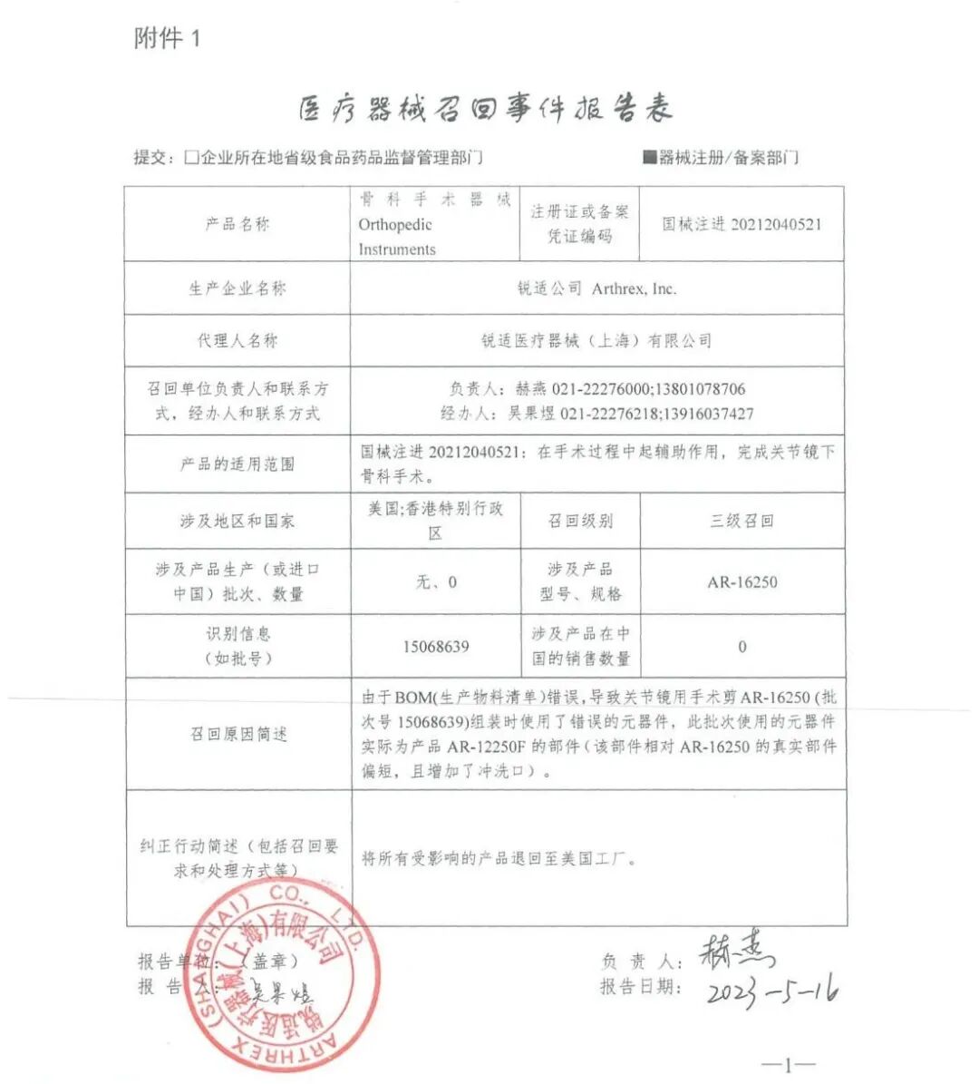 锐适医疗器械(上海)有限公司报告,由于生产制造过程中元器件使用错误,生产商锐适公司 Arthrex, Inc.对骨科手术器械Orthopedic Instruments(国械注进20212040521)主动召回。召回级别为三级召回。