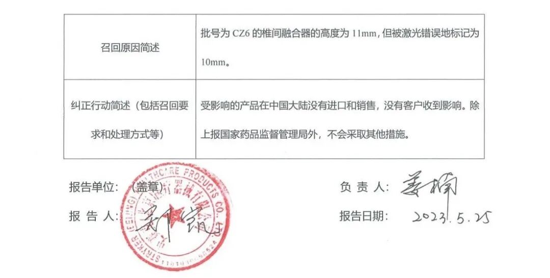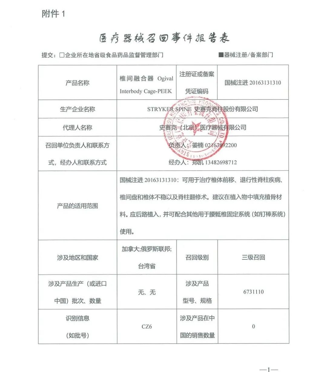 史赛克(北京)医疗器械有限公司报告,由于椎间融合器的高度标记错误,生产商史赛克脊柱股份有限公司STRYKER SPINE 对椎间融合器Ogival Interbody Cage-PEEK(国械注进20163131310)主动召回。召回级别为三级召回。