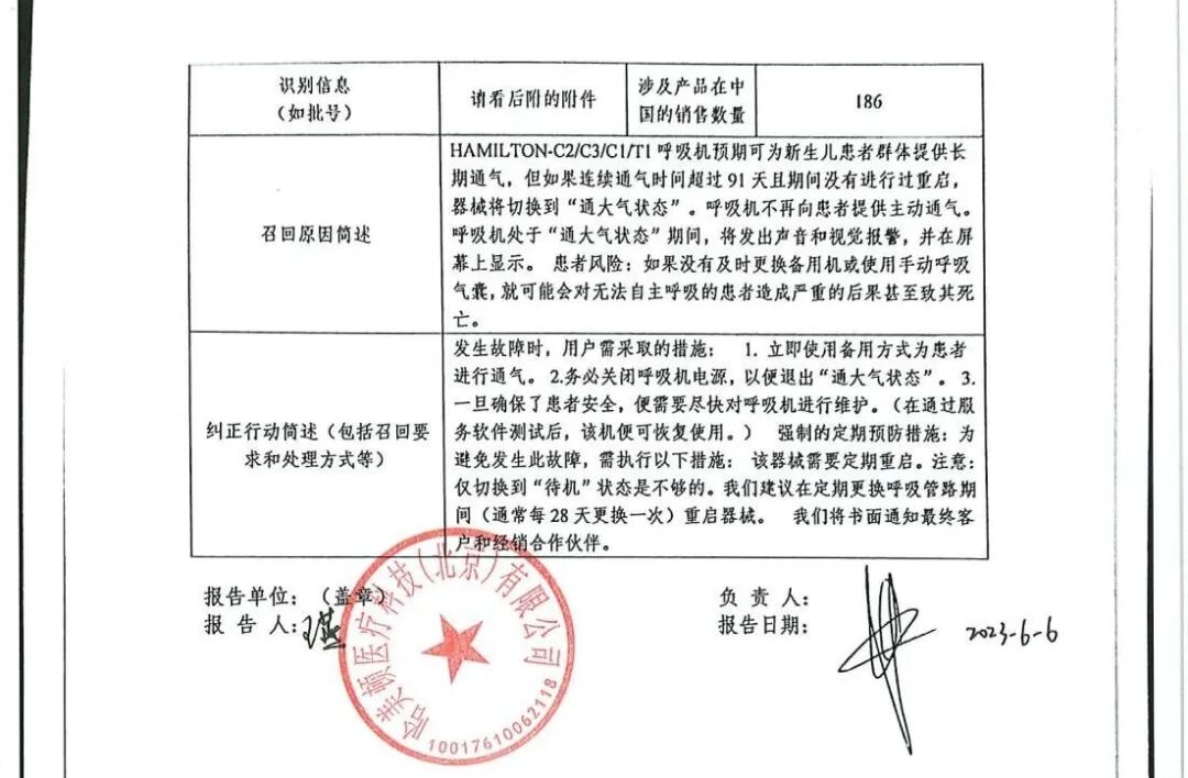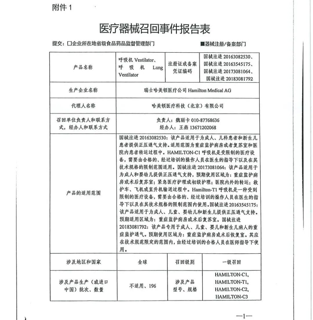 哈美顿医疗科技(北京)有限公司报告,因产品存在若连续通气时间超过91天且未进行过重启,将造成不再向患者提供主动通气的问题,生产商瑞士哈美顿医疗公司Hamilton Medical AG对呼吸机(国械注进20163082530、国械注进20163545175、国械注进20173081064、国械注进20183081792)主动召回。召回级别为一级召回。