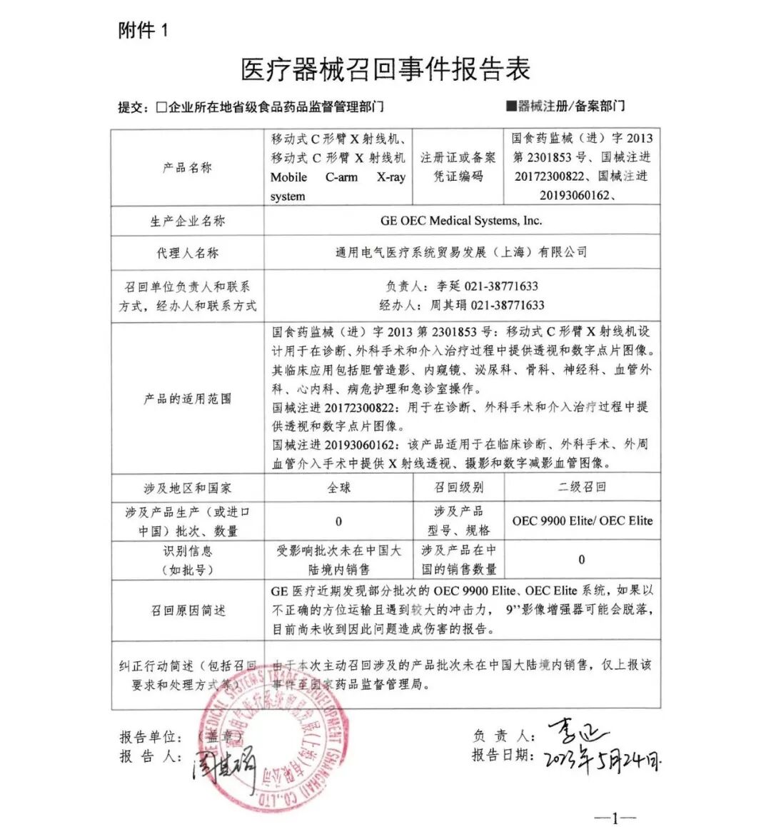 通用电气医疗系统贸易发展(上海)有限公司报告,由于以不正确的方位运输且遇到较大的冲击力, 9”影像增强器可能会脱落,生产商GE OEC Medical Systems, Inc.对移动式C形臂X射线机(国食药监械(进)字2013第2301853号、国械注进20172300822、国械注进20193060162)主动召回。召回级别为二级召回。