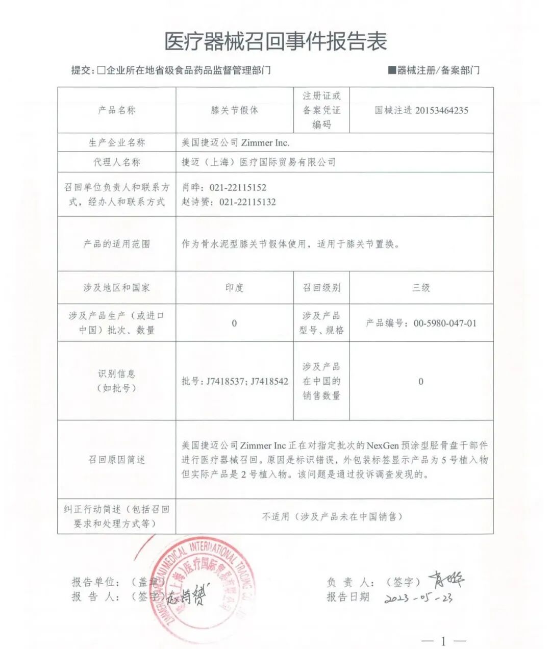 捷迈(上海)医疗国际贸易有限公司报告,由于特定批次产品标识错误,生产商美国捷迈公司Zimmer Inc.对膝关节假体(国械注进20153464235)主动召回。召回级别为三级召回。
