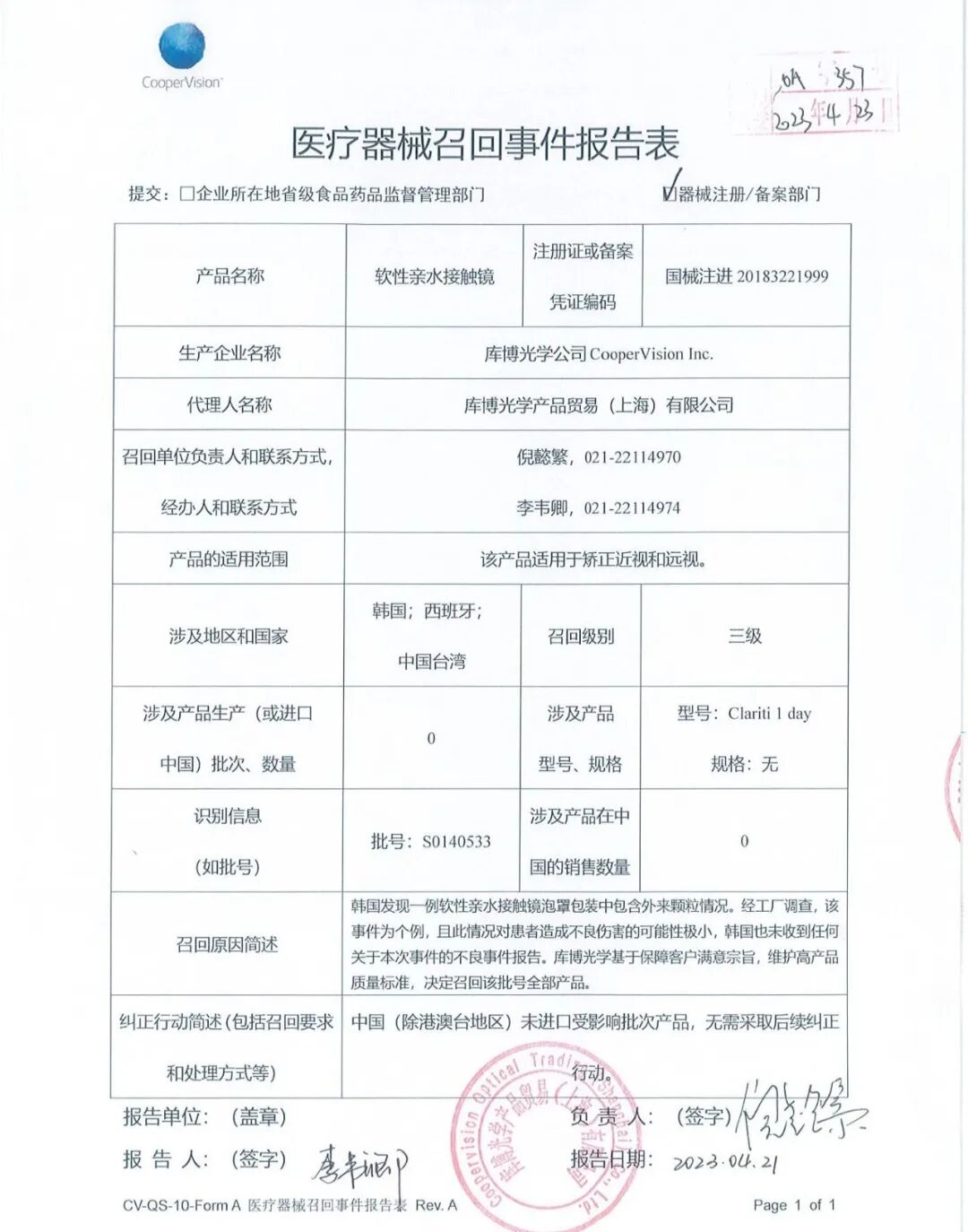 库博光学产品贸易(上海)有限公司报告,由于发现一例软性亲水接触镜泡罩包装中包含外来颗粒,生产商库博光学公司 CooperVision Inc.对软性亲水接触镜主动召回(国械注进20183221999)主动召回。召回级别为三级召回。
