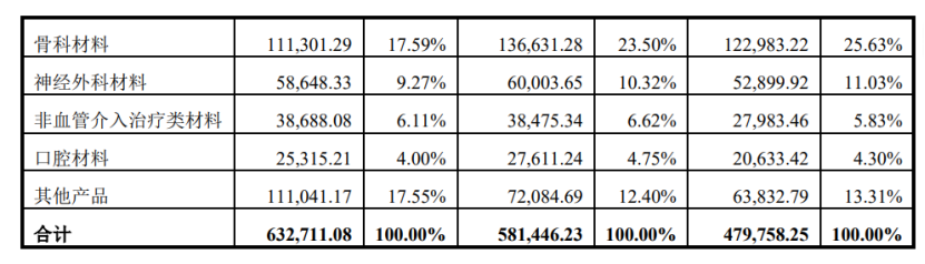 分产品来看,国科恒泰主要产品包括血管介入类治疗材料、骨科材料、非血管介入治疗类材料、神经外科材料、口腔材料及其它产品,2022年营收占比分别为45.47%、17.59%、9.27%、6.11%、4.00%、17.55%。其中,