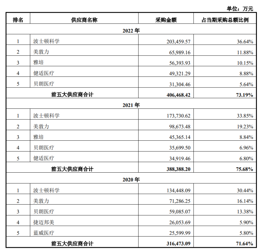 占同期采购总额的46.57%、53.08%和48.52%。除波科和美敦力外,国科恒泰还与